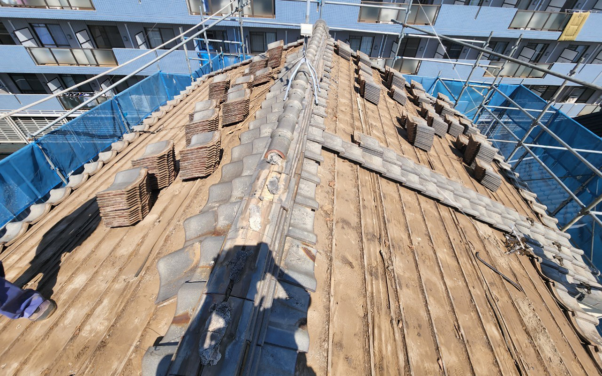 重かった瓦屋根を剥し、下地に新たなコンパネを貼りなおしました。